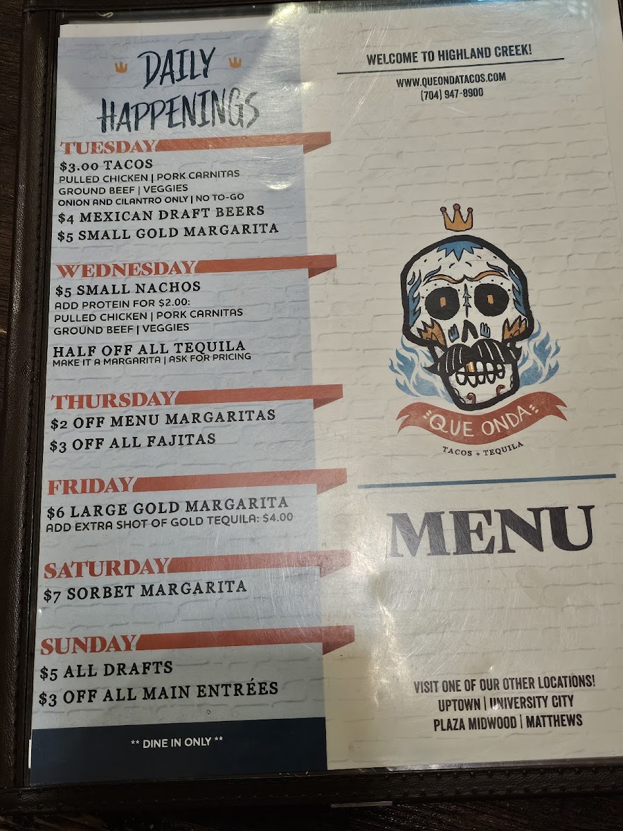 Welcome to Que Onda Cantina Highland Creek! Located at 13016 Eastfield Rd, Huntersville, NC, this vibrant cantina offers a delightful fusion of traditional Mexican flavors and modern dining experiences. The menu boasts an impressive array of family meals like the Pollo Guajillo and Gringo Tacos, designed for sharing and savoring with loved ones.